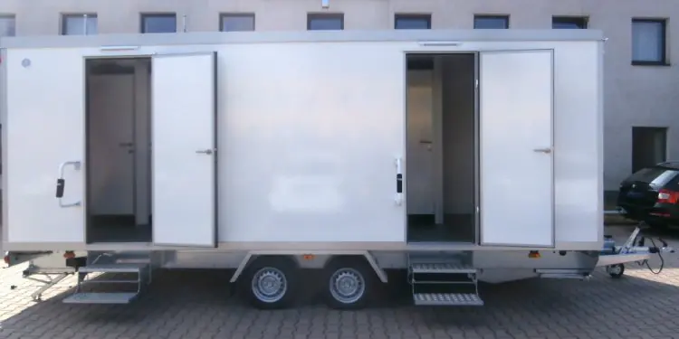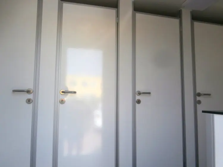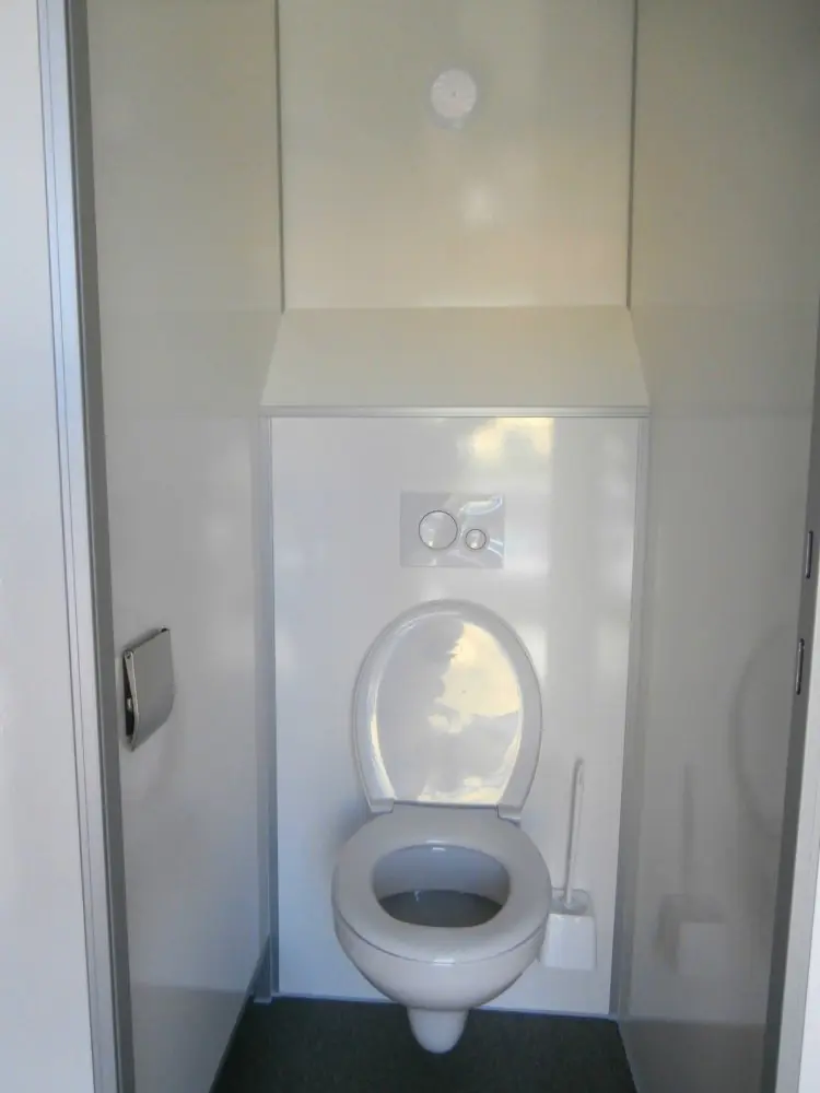 - Hänge-WC (4x im Damenabteil, 2x im Herrenabteil), Toilettenpapierhalter, WC-Bürste, Kleiderhaken.