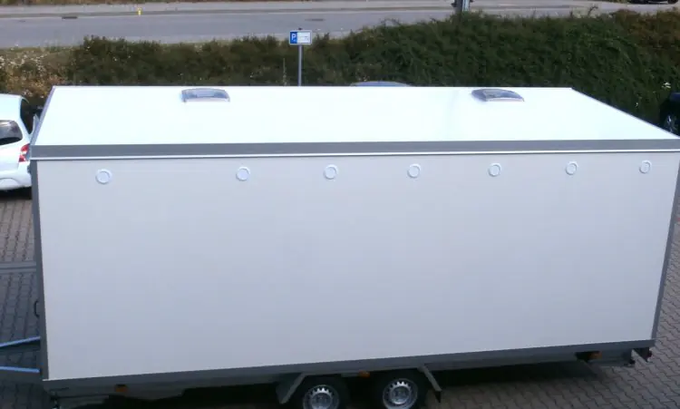- Wände: Gesamtstärke 50 mm Sandwichpaneel, besteht beiderseits aus GFK-Platte 1,5 mm stark und innen PU- Schaum.