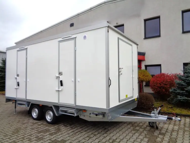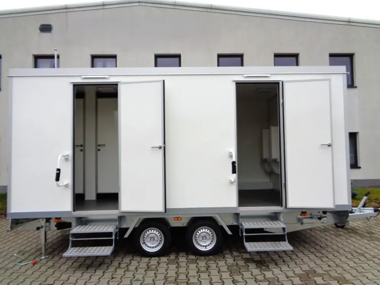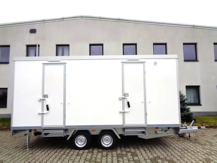 - Hänge-WC (3x im Damen-, 1x im Herrenabteil), Toilettenpapierhalter, WC-Bürsten, Kleiderhaken.